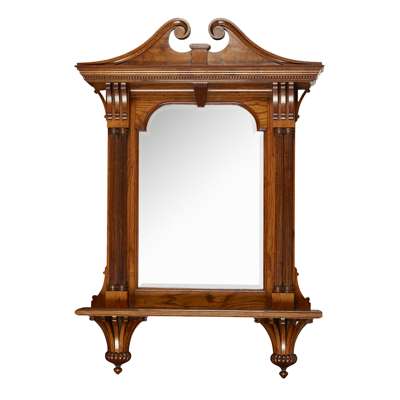 the swan neck pediment above an arched bevelled mirror plate, flanked by reeded cluster columns with open volute capitals, on a moulded plinth base with stylised scroll basket pendant finials
