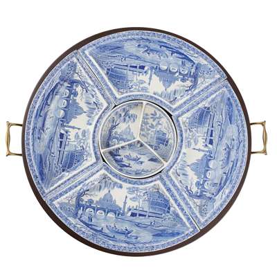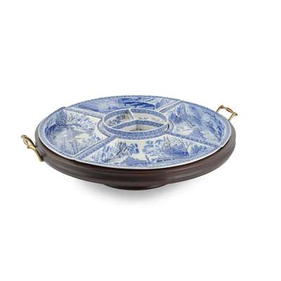 comprising four crescent-shaped dishes and a central divided circular dish, in the Tiber/Rome pattern, with maker's marks, in a mahogany Lazy Susan with twin brass handles