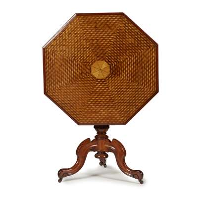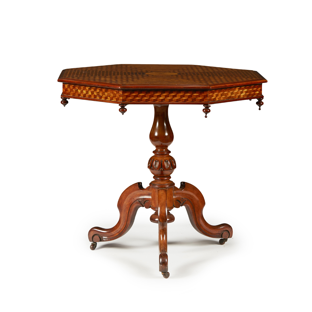 the octagonal tilt top centred by a fan medallion and radiating 'tumbling block' veneer panels, above a similarly inlaid frieze marked with turned drop finials, on a carved and turned baluster support raised on scrolling cabriole legs ending ceramic castors