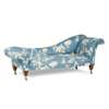 the serpentine padded back and scroll arms above a long padded seat, raised on short turned legs ending in brass caps and castors, in blue cotton print upholstery