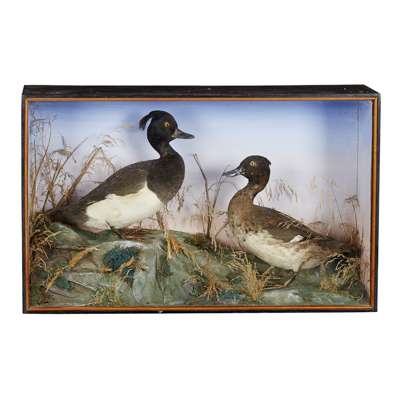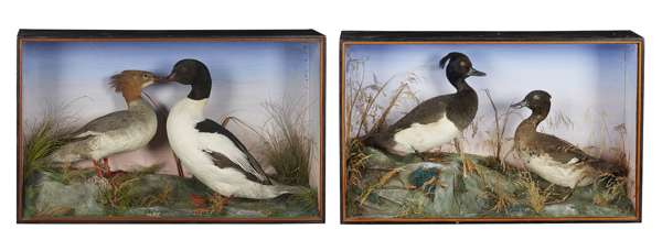 full mounts raised on 'rockwork', in painted glazed cases; comprising a pair of goosanders, case 79cm wide, 49cm high, 22cm deep; and a pair of tufted ducks, case 74cm wide, 46cm high, 23cm deep (2)
