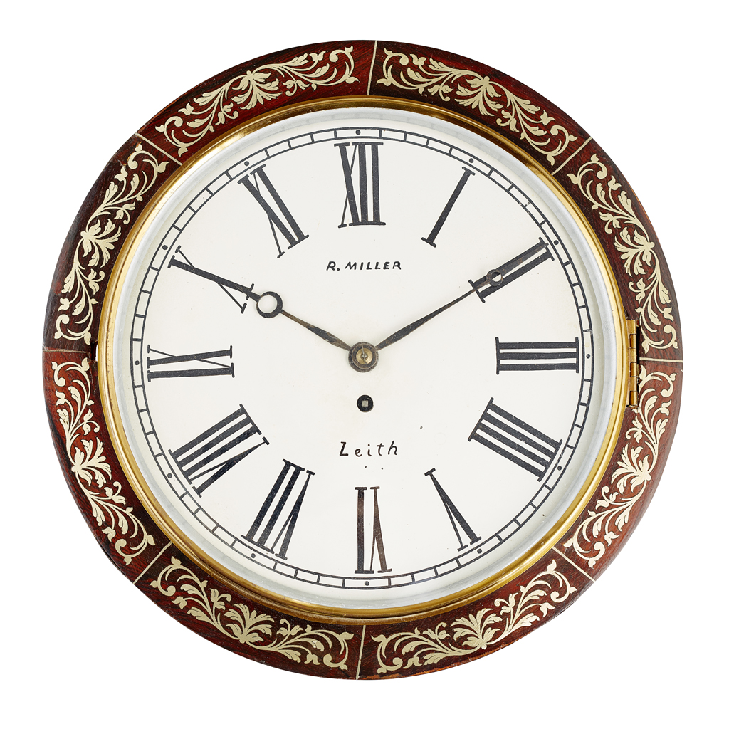 the white enamelled dial with Roman numerals, signed R. MILLER/ LEITH, in a rosewood case with scrolling foliate brass inlay