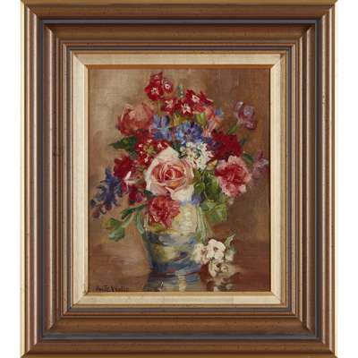 STILL-LIFE OF PINK AND BLUE FLOWERS