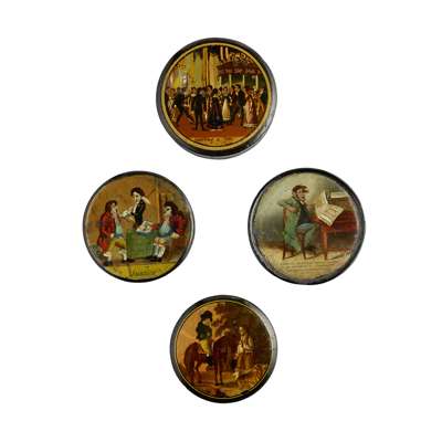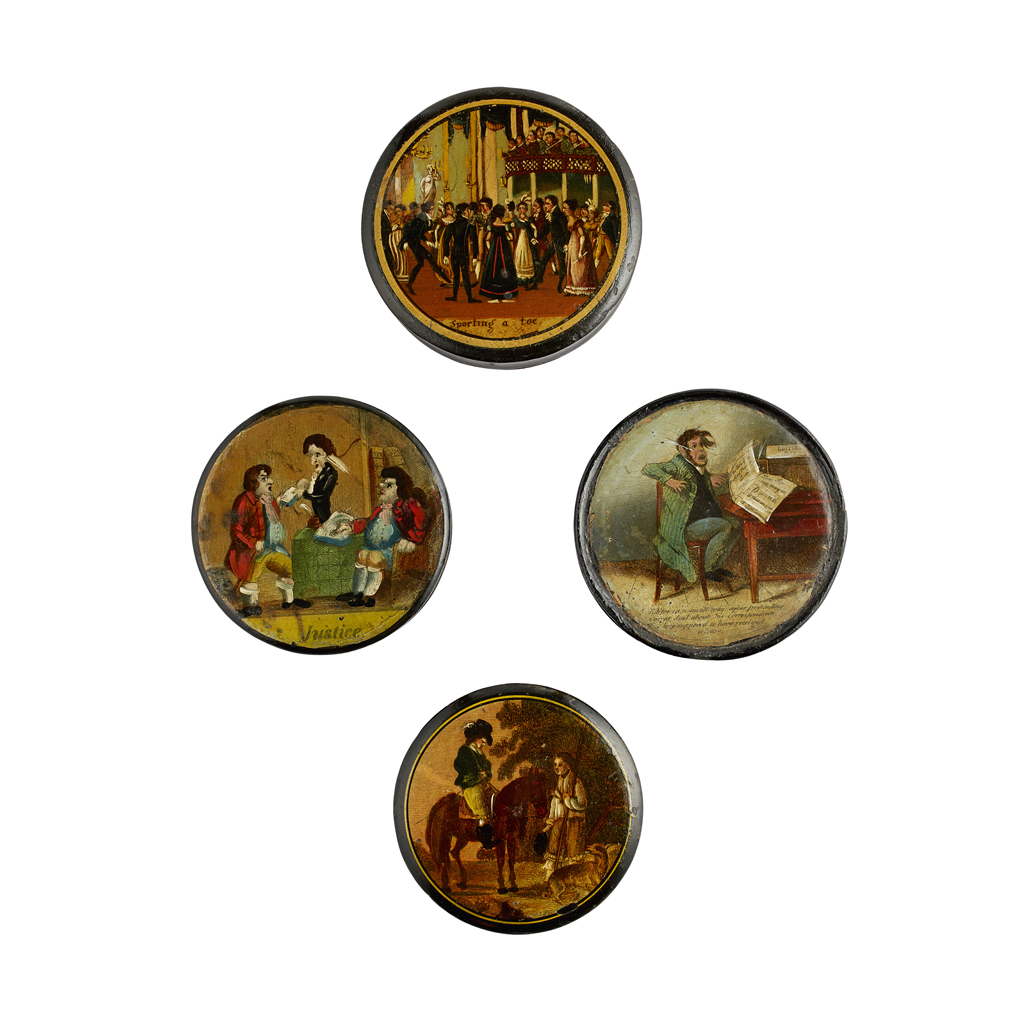 of circular form, each with printed and painted scenes with various inscriptions, including 'Justice' and 'Sporting a Toe'; one with a scene after Robert Seymour, and an example depicting a man on horseback (4)