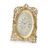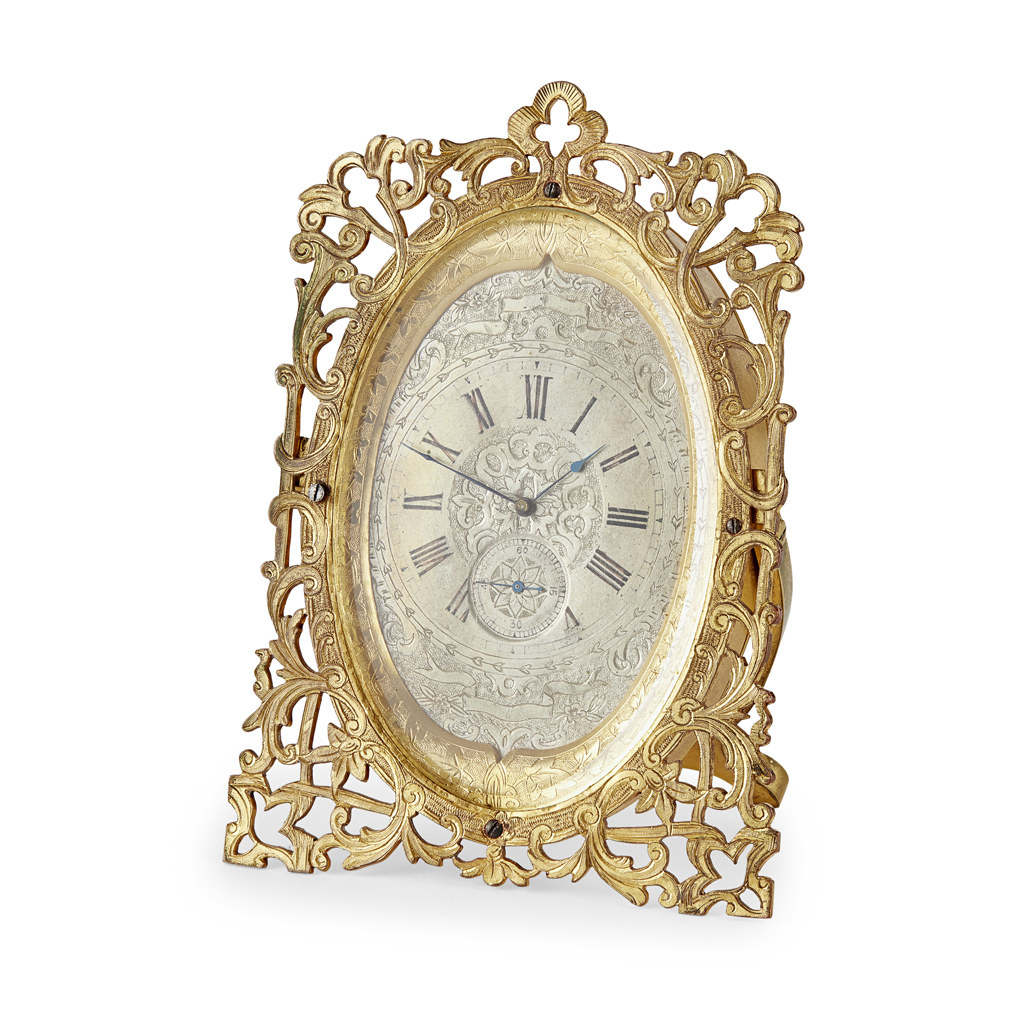 the decorative pierced frame enclosing an engraved silvered dial with Roman numerals, with an easel support