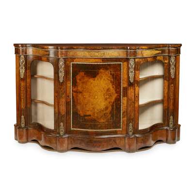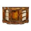 the serpentine top above a central door flanked by glazed doors opening to shelves, on a shaped plinth base, with gilt metal mounts