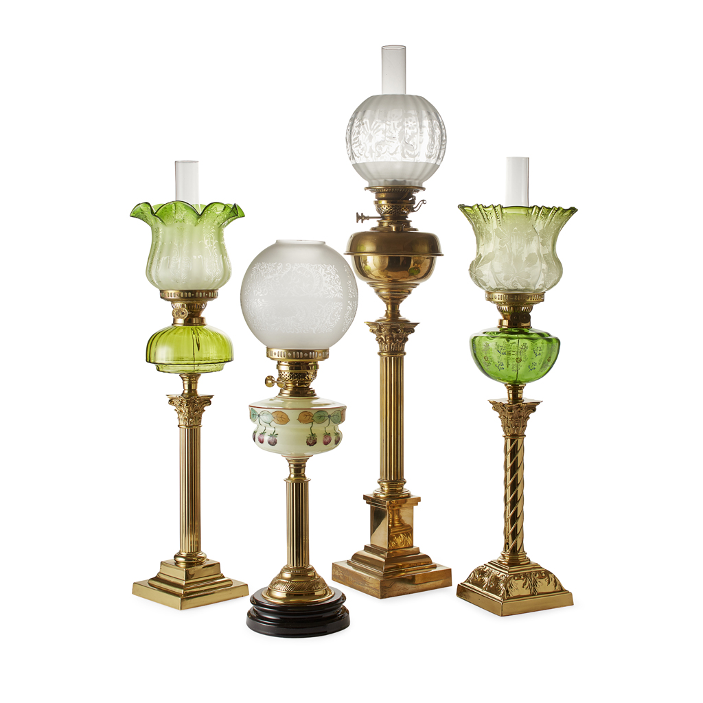 two with acid etched globular shades, two with acid etched green fluted shades, one with brass reservoir, another with painted glass reservoir, two with green glass reservoirs, three raised on brass Corinthian columns, the other on a plain column, two wired for electricity, largest 91cm high (including shade) (4)