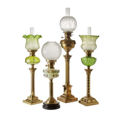 GROUP OF FOUR VICTORIAN BRASS PARAFFIN LAMPS