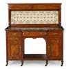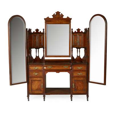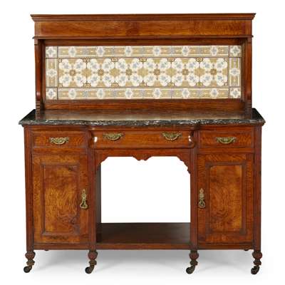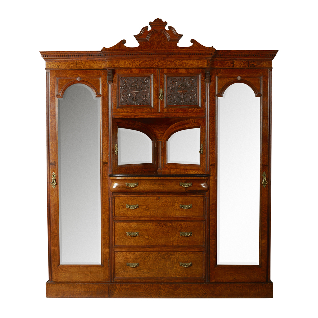 comprising a WARDROBE, with carved panels and two mirrored doors (includes two keys), 209cm wide, 245cm high, 61cm deep; a WASHSTAND, with tiled splash back and marble top, 123cm wide, 132cm high, 58cm deep; a DRESSING TABLE, with side mirrors, 213cm wide (including mirrors), 187.5cm high, 63cm deep; and a BEDSIDE CABINET, 39cm wide, 84cm high, 40cm deep, with applied and stamped maker's marks (4)