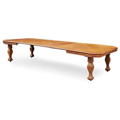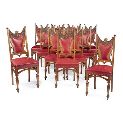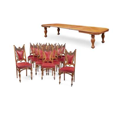 comprising a set of twelve chairs and an extending dining table; the chairs with shaped and padded backs carved with stylised flower motifs between capped uprights, over stuffover seats, in red leather upholstery, raised on square baluster legs with porcelain castors; two chairs of slightly taller profile; the wind-out table with canted corners above a moulded frieze, raised on square baluster legs, with four leaf extensions (13)