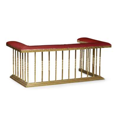 the red leather padded top with brass stud trim, raised on spiral rails and a moulded base
