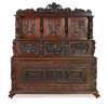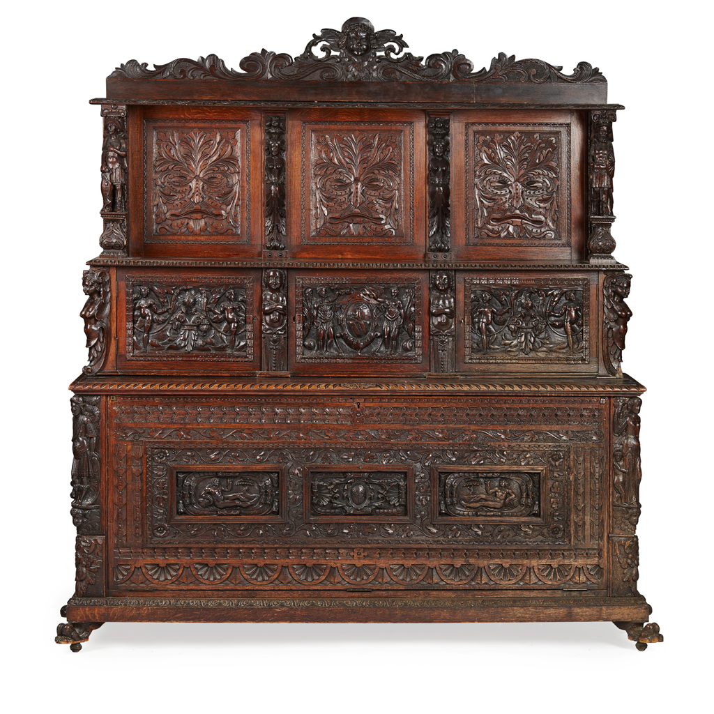 the carved pediment over a tiered back with carved Green Man panels flanked by figural supports, above three carved panel cupboard doors, the central panel with an armorial; the base with a fall front fitted with a carved triple panel front depicting figures flanked by caryatids, raised on carved paw feet