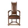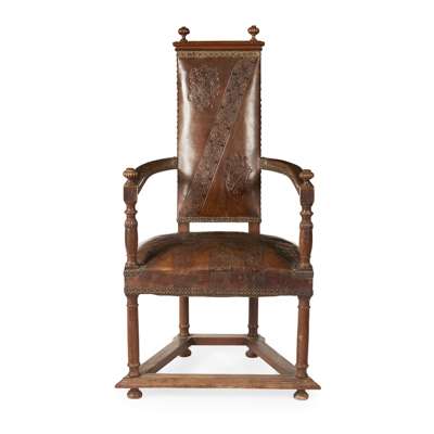 the padded back with lobed finials above a wide seat and curved arms covered in brown leather embossed with armorials, on turned legs joined by moulded peripheral stretchers on bun feet