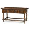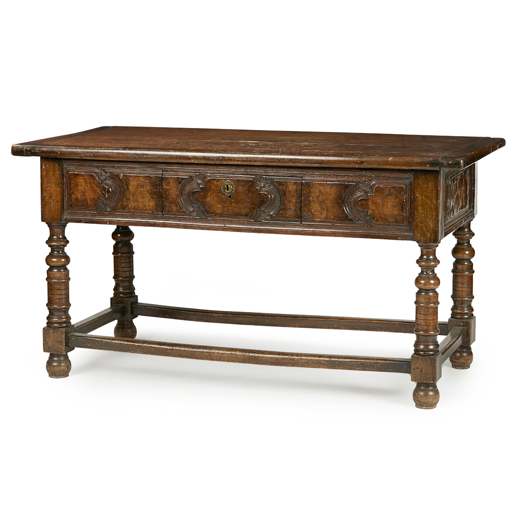 the two board cleated top above a moulded panel frieze with a central drawer, raised on turned legs joined by peripheral stretchers and ending on ball feet; the underside with an ivorine trade label 'Muirhead & Moffat & Co. Antiques Glasgow'