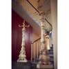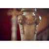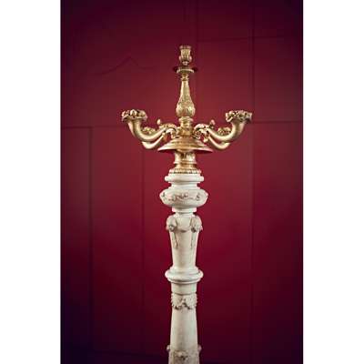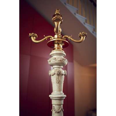 with a central stiff and four scrolling ormolu arms in the form of fruiting cornucopia, ending in drip pans and candle nozzles, on tapering baluster columns carved with female masks and drapery swags, acanthus, double-headed eagles, rams' and lions' masks on a tripartite base with hairy paw feet (2)