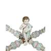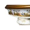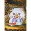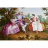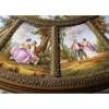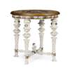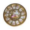 the circular top with a central panel enclosed by thirteen smaller panels, decorated with scenes of ladies and gentlemen in 18th century dress engaged in various pursuits in landscapes, in a gilt metal and gilt wood frame, above a frieze of similarly decorated porcelain panels, raised on four baluster and tapered legs with applied flowers ending in scroll feet and joined by a shaped X stretcher surmounted by a putto