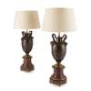 with twin-mask form handles above the shouldered bodies, decorated with scenes of the Sacrifice of Venus, raised on fluted red marble plinth bases and toupie feet, converted to lamps, with cream shades (2)