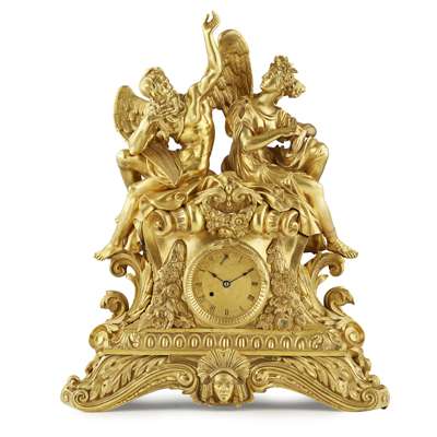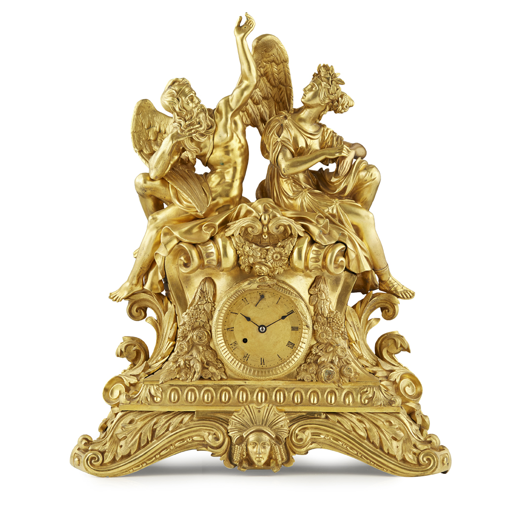 the signed circular engine-turned dial with a Roman number chapter and subsidiary 'FAST/SLOW' dial, set in a waisted rococo style case with acanthus scrolls, floral garlands, and a classical mask, surmounted by the figures of Chronos and Ananke; the movement inscribed 'Arnold & Dent London/ 524'