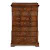 the rectangular stepped top above a frieze drawer over six further drawers, the top three flanked by turned pilasters, on a plinth base with bracket feet