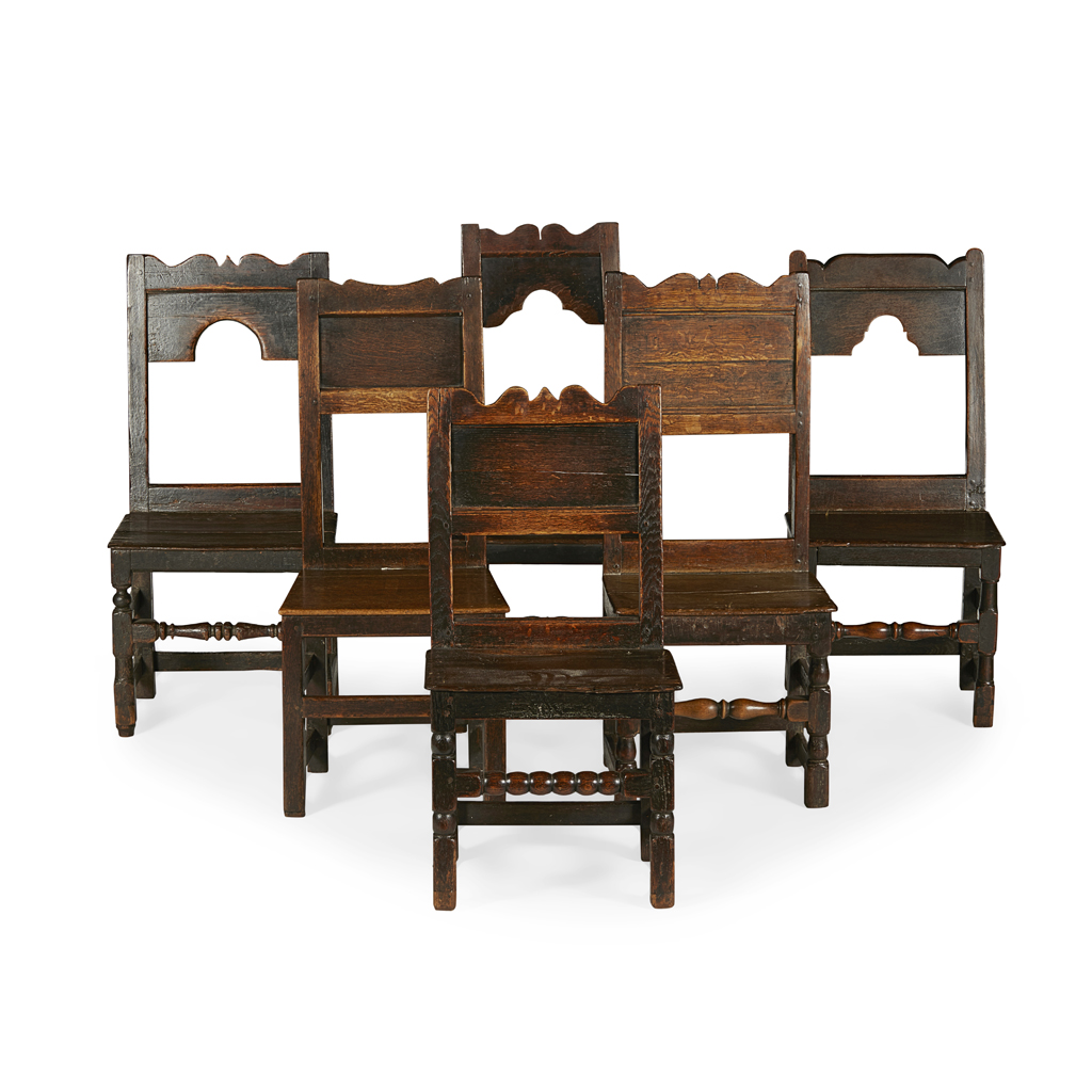 with panelled or arched backs above solid seats and turned and blocked legs joined by stretchers (6)