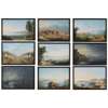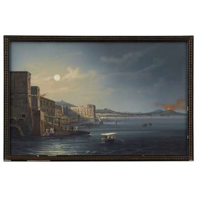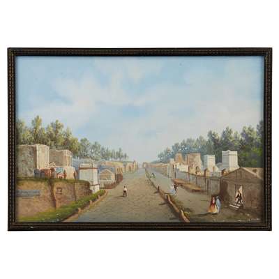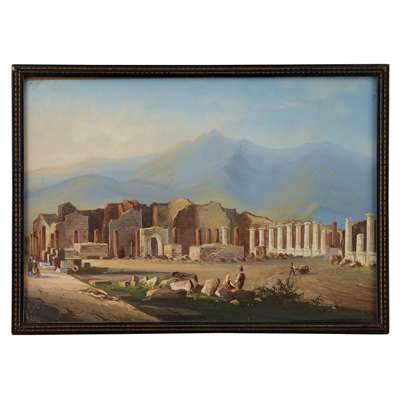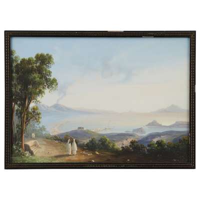 depicting various Italian scenes and figures, including landscapes, classical ruins, coastal views of Naples, and the eruption of Mount Vesuvius, in ebonised frames (9)