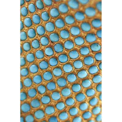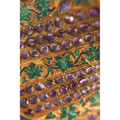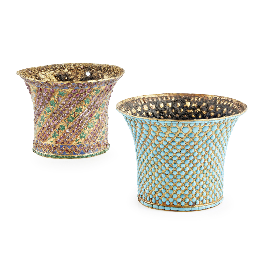 each of everted form; the first with two scrolled bands enclosing diagonal rows of gemstones (possibly foil-backed rubies) and enamelled fruiting vines, 6.3cm high, 8.5cm diameter (widest point); the second inset allover with graduated pieces of turquoise, 6.4cm high, 8.8cm diameter (widest point) (2)