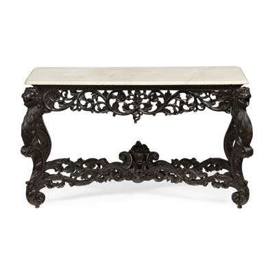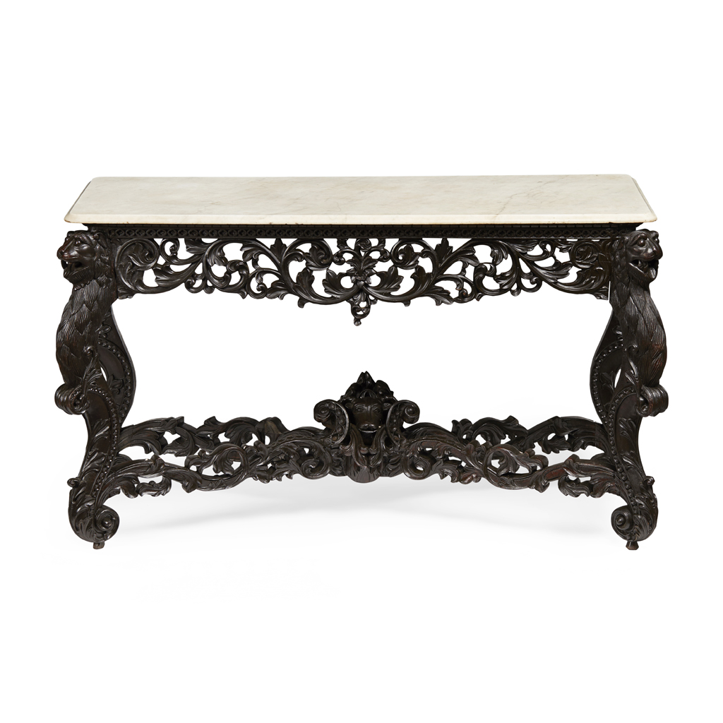 the rectangular white marble top with a moulded edge over a foliate carved and pierced frieze, raised on acanthus carved cabriole legs headed by lions' masks and ending on scrolled feet, with a pierced X stretcher surmounted by a carved cow's head