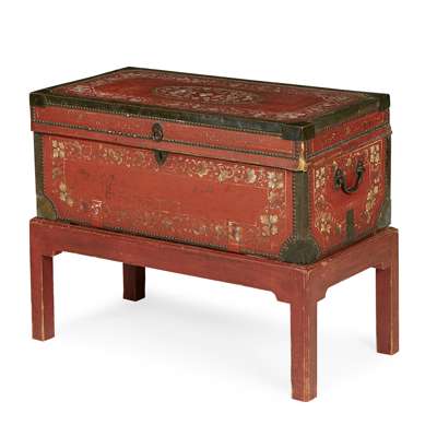 in red leather painted with bands of flowers within stud trim and metal banded edges, on a later stand