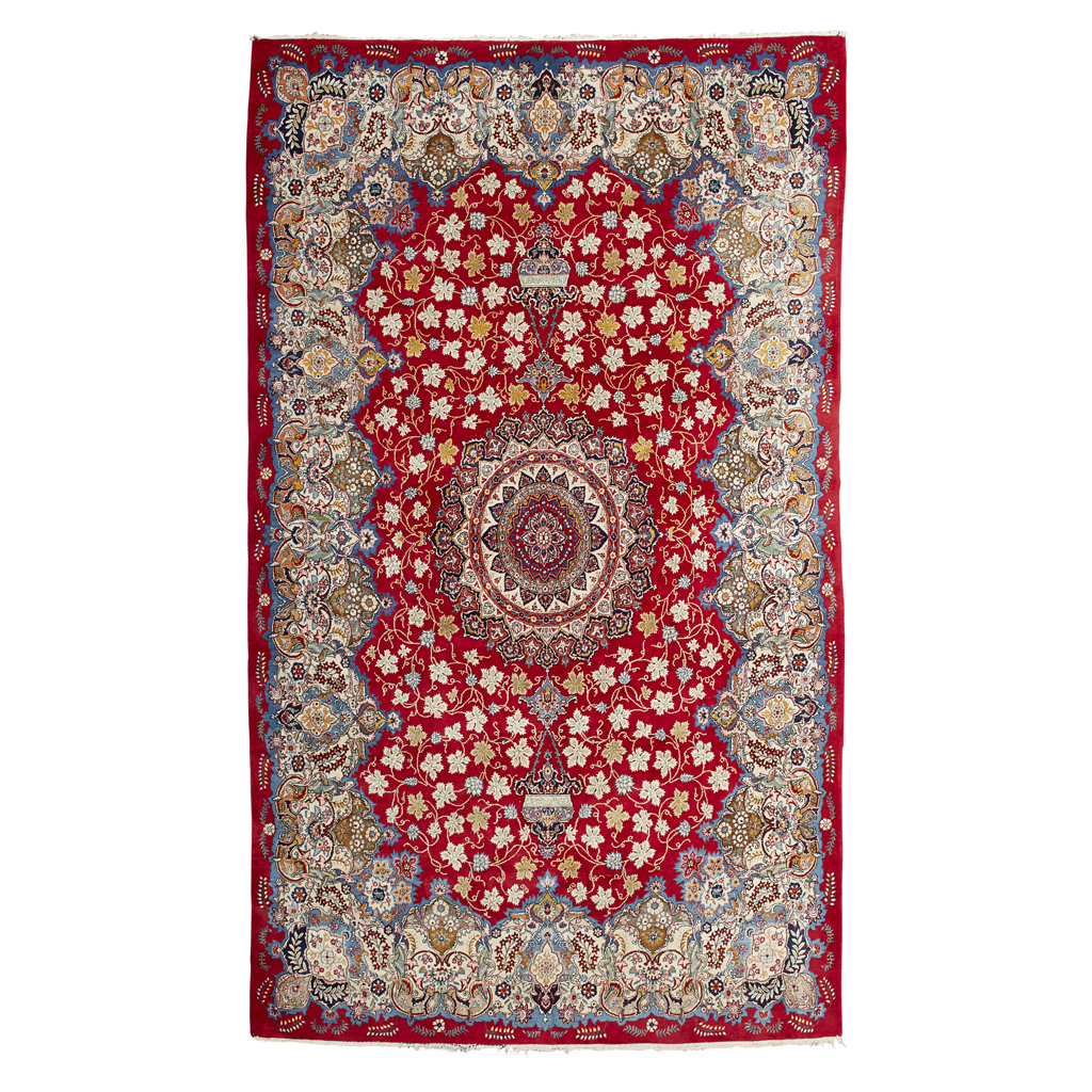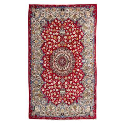 the red field with cream and red medallion, within shaped polychrome foliate border