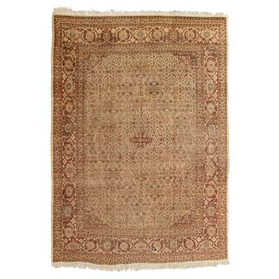 the olive field with cream medallion, similar spandrels, allover herati pattern, within rust red palmette, rosette and vine border