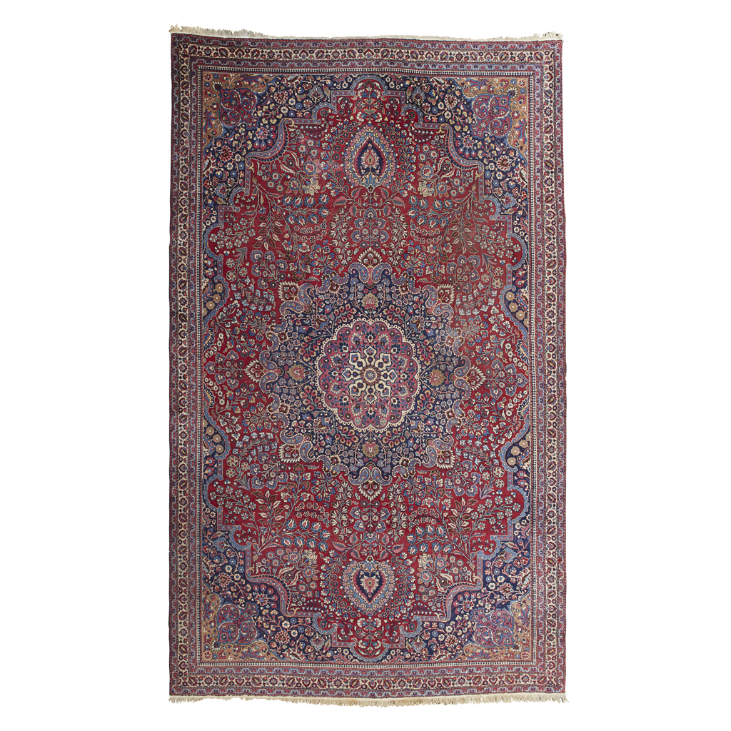the red field with indigo and pink medallion, indigo and brown spandrels, within narrow cream palmette and vine border