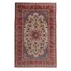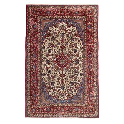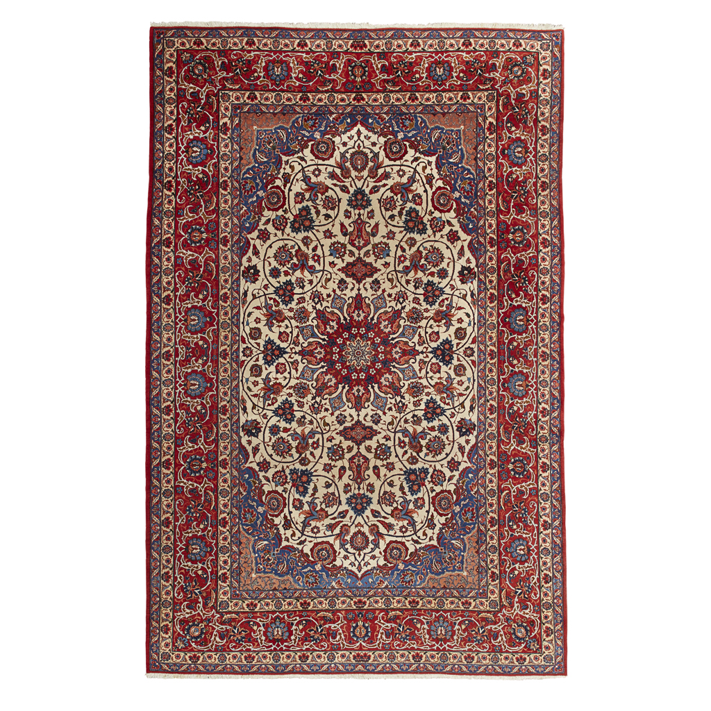 the cream field with red medallion, blue and brown spandrels, within red palmette and arabesque vine border