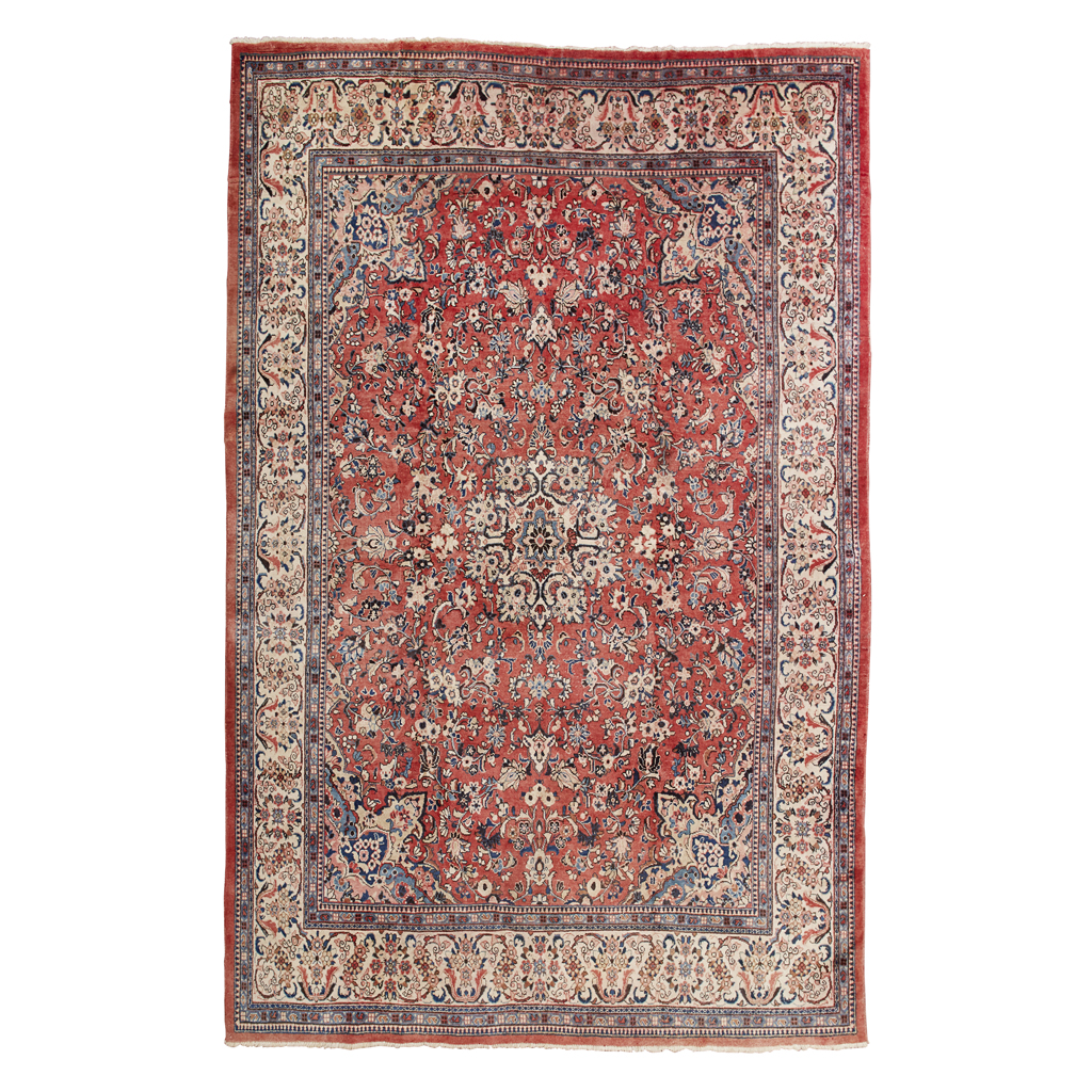 the red field with cream medallion, within cream floral vine border
