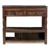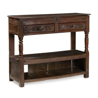 the hinged top with a moulded edge above two short frieze drawers, carved with lunettes and stylised foliate motifs, on turned supports and an undertier and base, raised on stile feet