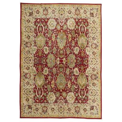 of classical Persian pattern, the red field with allover palmette and foliate pattern, within pistachio palmette and foliate vine border
