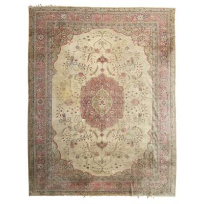 the cream field with pink and olive medallion, olive spandrels, within pink rosette and vine border