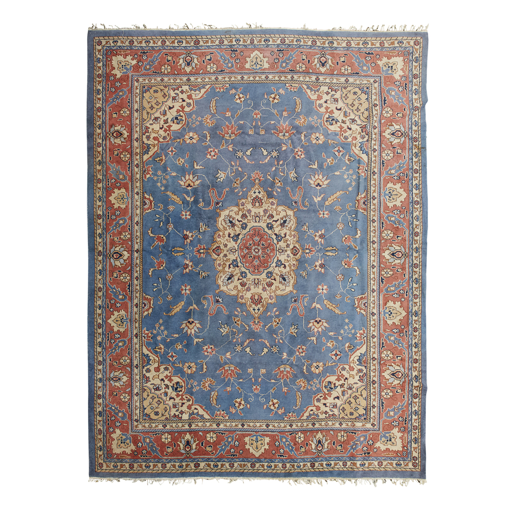 the blue field with cream and pink medallion, cream and camel spandrels, within pink palmette and vine border