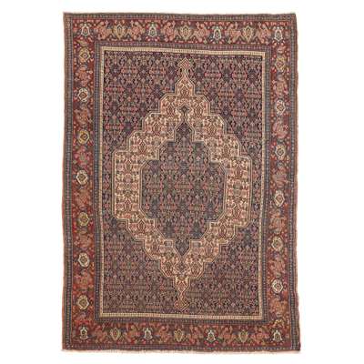 the indigo field with large cream and indigo medallion, allover herati pattern, within red turtle palmette and vine border