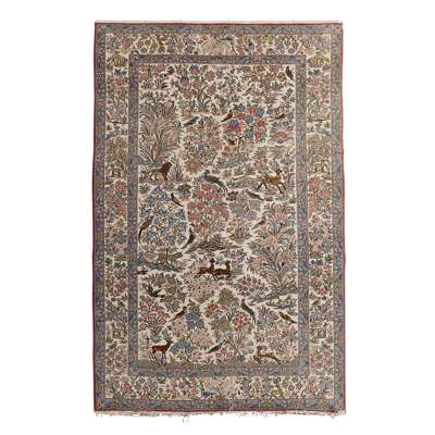 the cream field with allover pattern of animals and birds amidst foliate blooms, within similar border