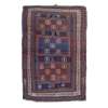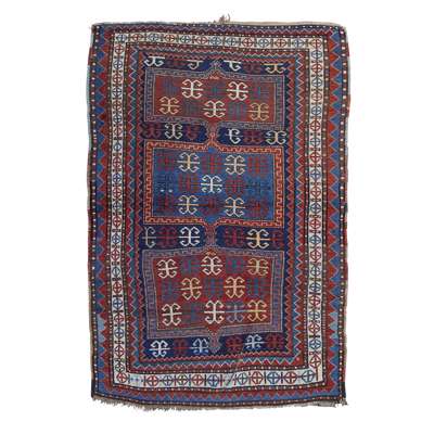 the indigo field with three red and blue rectangular medallions, within narrow cream geometric border