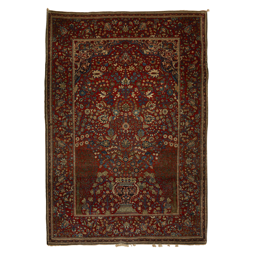 the red mihrab with foliate vase flanked by trees to one end, ivory spandrels to the other, within red palmette and foliate vine border