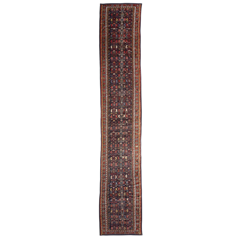 the indigo field with allover stylised foliate columns, within narrow rust stylised rosette and vine border