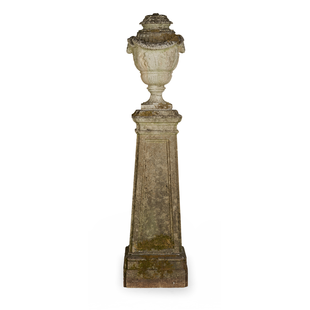 the urn and cover with drapery swags and a band of putti on a fluted socle; the tapered square column on a separate plinth base