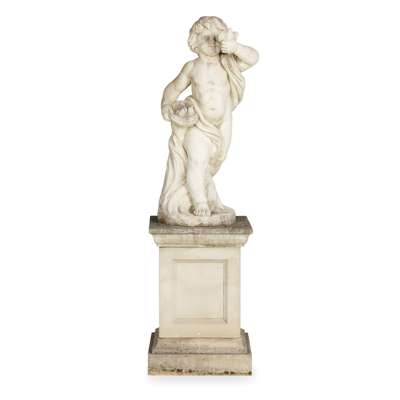 modelled as a draped putto holding a bird and a cornucopia; on a separate square moulded pedestal base