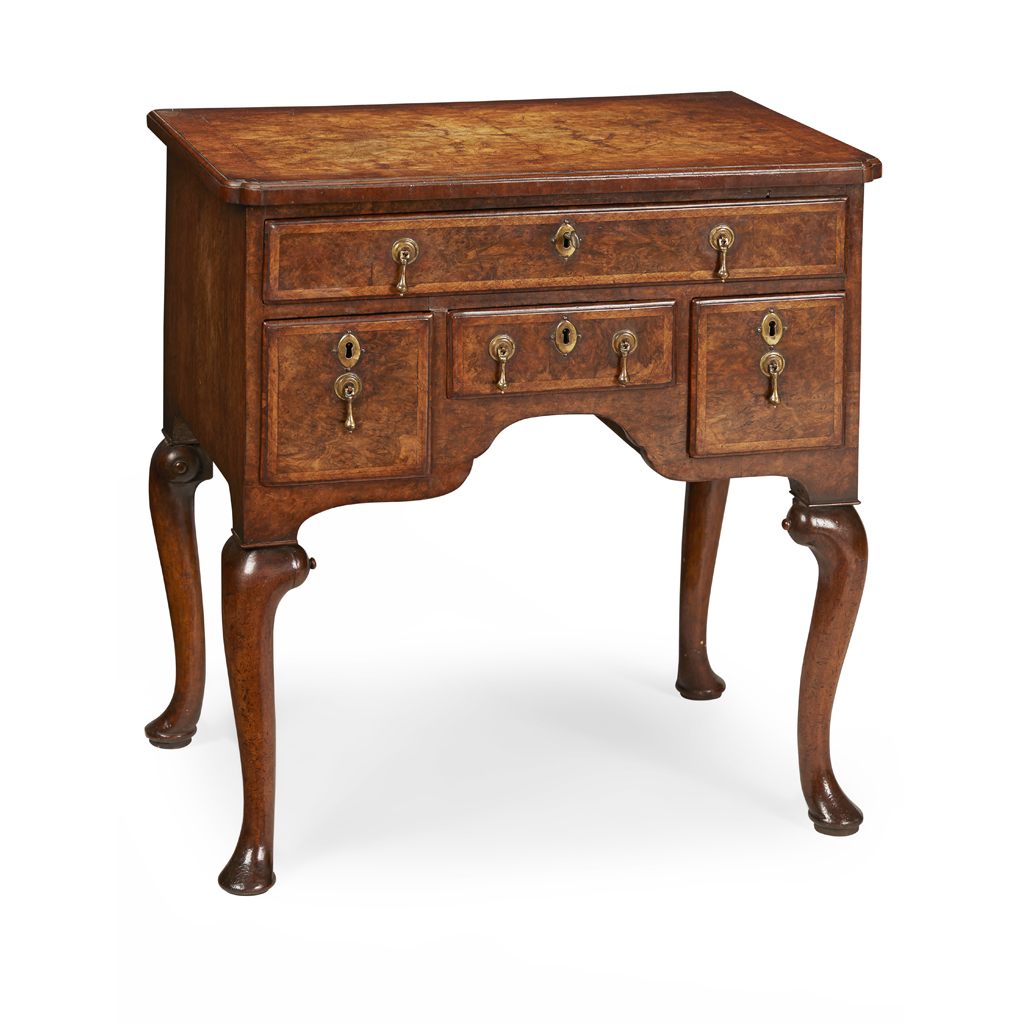 the quarter veneered and crossbanded top above a long drawer over three short drawers arranged around an arched recess, raised on cabriole legs ending in pad feet