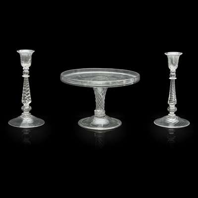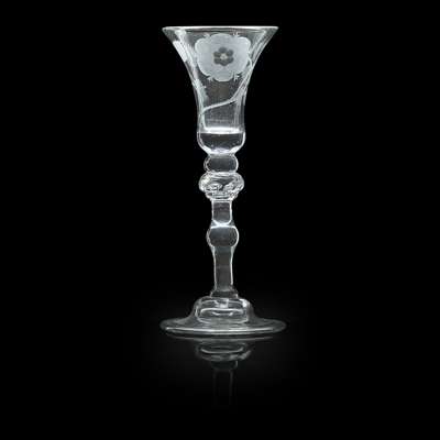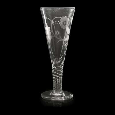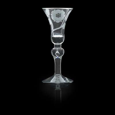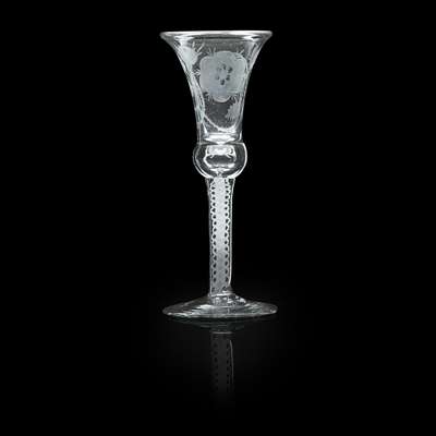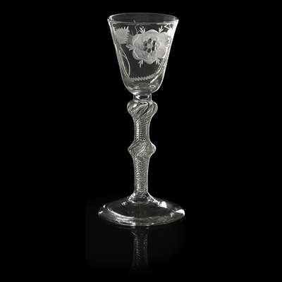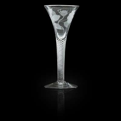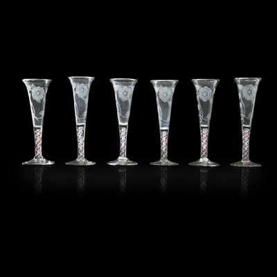 IMPORTANT SET OF SIX JACOBITE ENGRAVED COLOURED ENAMEL TWIST WINE GLASSES