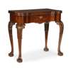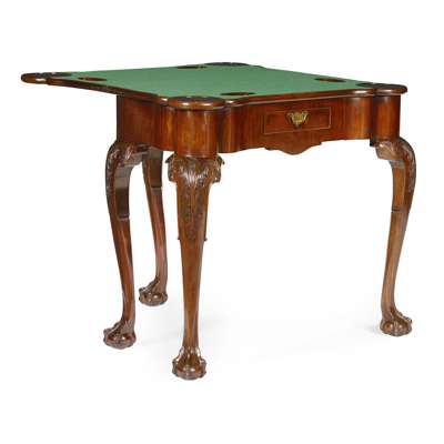 the fold-over top with rounded outset corners, opening to a green baize playing surface with counter wells, above a single frieze drawer, raised on acanthus carved cabriole legs ending in claw and ball feet