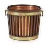 with slatted sides and two brass bands and loop handles, fitted with a copper and brass insert