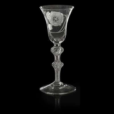 the trumpet bowl engraved with a displayed open rose head, buds, leaves and butterfly, with a double-knop air-twist stem and conical foot