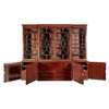 the moulded cornice and tassel moulded frieze above a pair of astragal glazed doors carved with water leaf details and opening to shelves, flanked by single astragal glazed doors and shelves; the conforming base with a pair of moulded panel doors opening to drawers, the top drawer previously fitted for writing, flanked by corresponding moulded doors opening to shelves and drawers, on a narrow plinth base